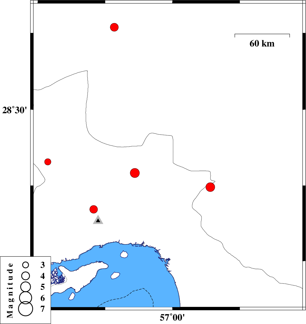 2020/08/03 | 12:34:58.1 | 17:04:58.1 | 27.68 | 56.49 | 13 | ML:3.9 | Hormozgan Province, 59 km North-East of Bandar-e abbas | ||