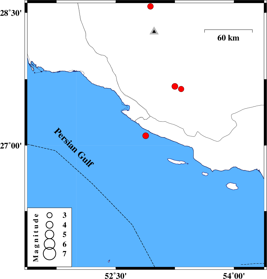 2020/10/25 | 09:44:20.3 | 13:14:20.3 | 27.11 | 52.88 | 10 | ML:3.5 | Persian Gulf, 49 km South of Mehr | ||