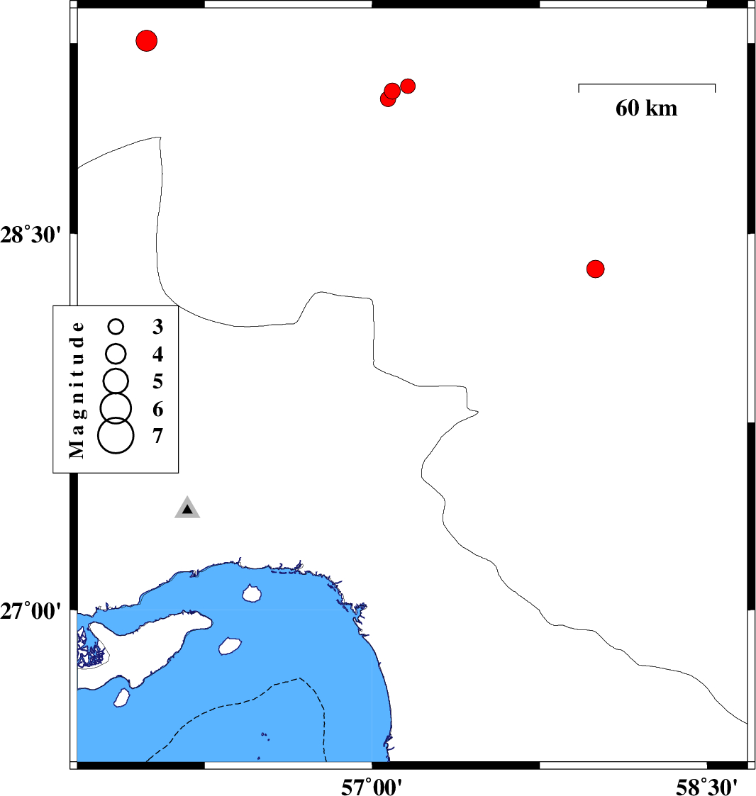 2021/01/24 | 00:57:05.8 | 04:27:05.8 | 27.21 | 58.11 | 10 | ML:3.5 | Kerman Province, 65 km South-East of Manujan | ||