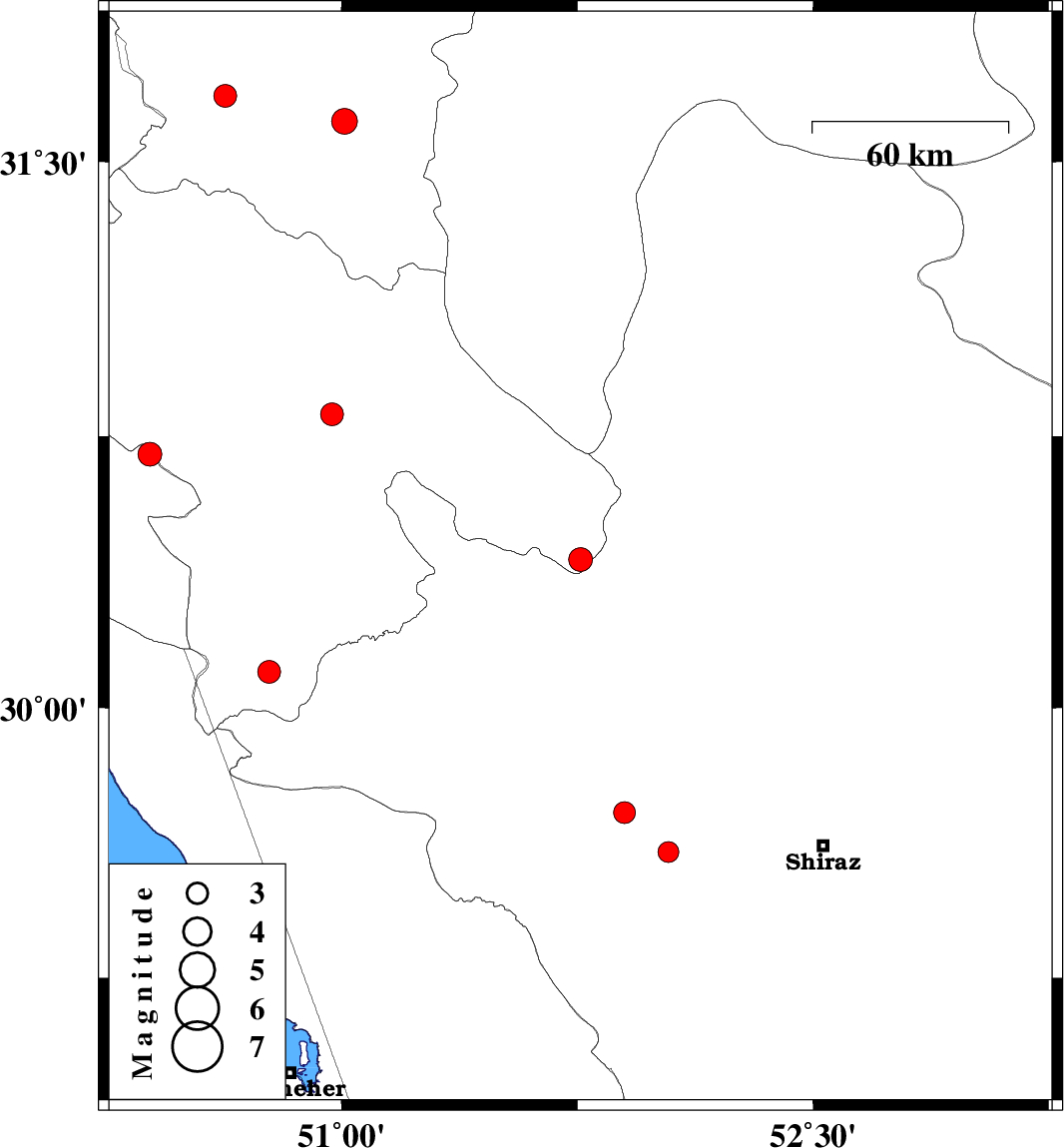 2021/01/14 | 17:38:04.1 | 21:08:04.1 | 29.71 | 51.9 | 10 | ML:3.1 | Fars Province, 26 km -East of Kazerun | ||