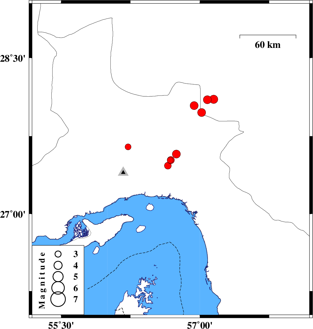 2023/04/07 | 02:20:21.5 | 05:50:21.5 | 27.647 | 56.224 | 16 | ML:3 | Hormozgan Province, 52 km North of Bandar-e abbas | ||