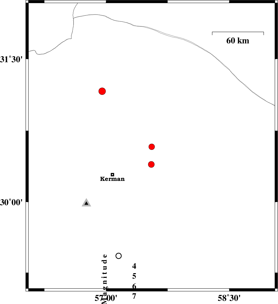 2023/08/09 | 02:25:43.2 | 05:55:43.2 | 30.581 | 57.556 | 12 | ML:3.2 | Kerman Province, 56 km North-East of Kerman | ||