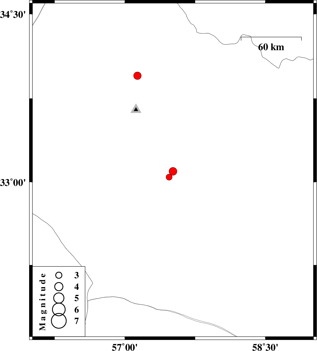 2023/08/04 | 18:00:10.1 | 21:30:10.1 | 33.953 | 57.135 | 12 | ML:3.6 | Khorasan(center) Province, 44 km North-East of Tabas | ||