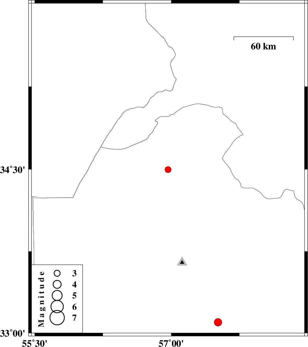 2023/08/15 | 05:57:41.6 | 09:27:41.6 | 33.097 | 57.514 | 12 | ML:3.8 | Yazd Province, 78 km South-East of Tabas |