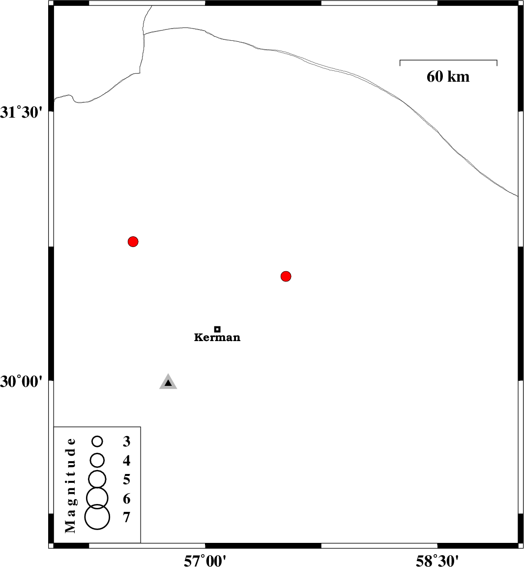 2023/09/21 | 17:08:10.9 | 20:38:10.9 | 30.583 | 57.521 | 12 | ML:3 | Kerman Province, 54 km North-East of Kerman | ||