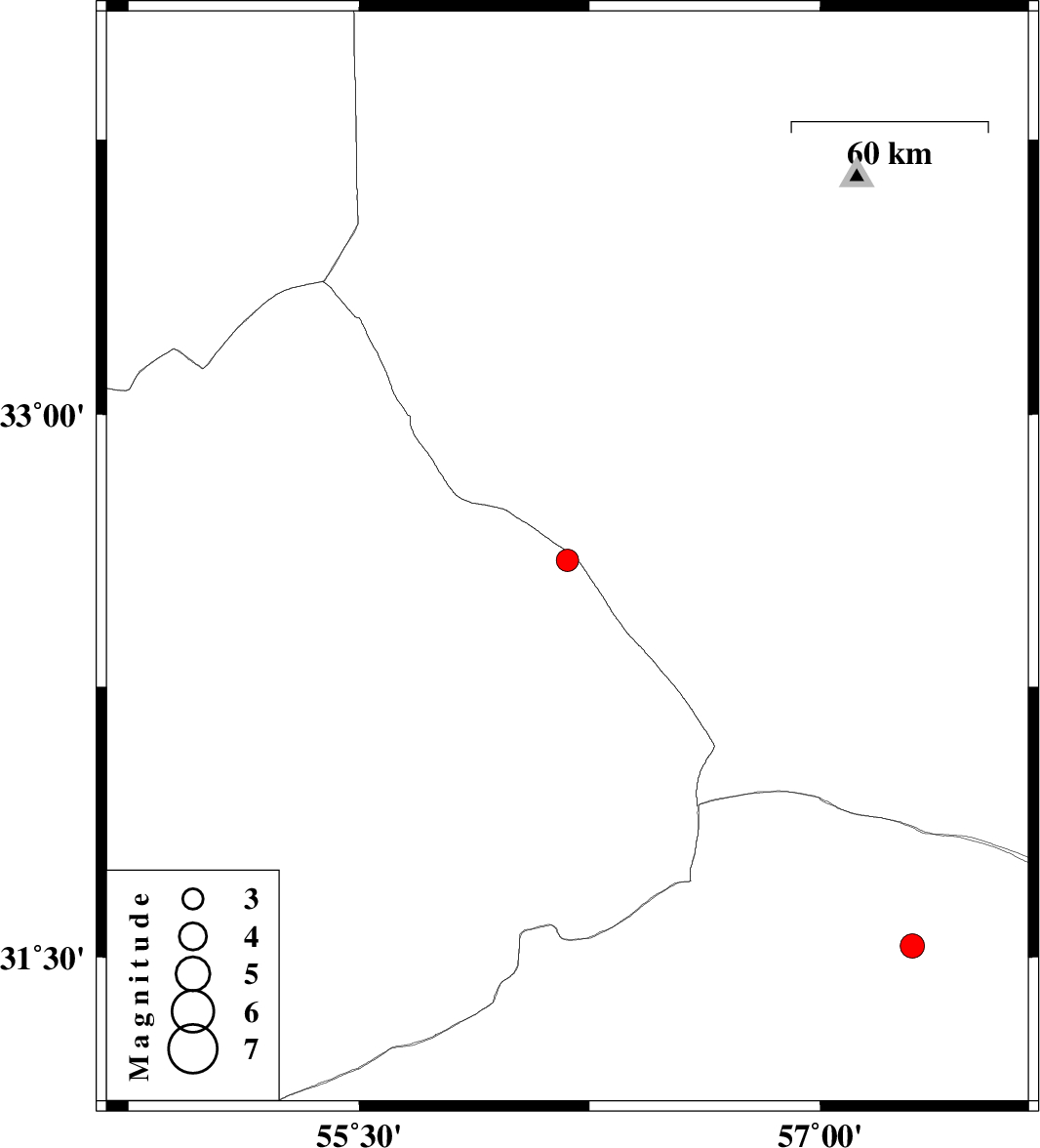 2023/11/03 | 10:07:39.9 | 13:37:39.9 | 31.531 | 57.301 | 16 | ML:3.5 | Kerman Province, 55 km North-East of Ravar |