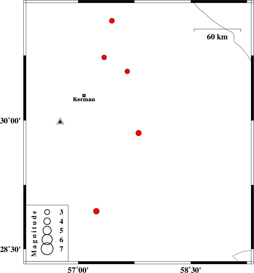 2023/12/23 | 16:37:57.9 | 20:07:57.9 | 30.567 | 57.655 | 10 | ML:3 | Kerman Province, 63 km North-East of Kerman | ||