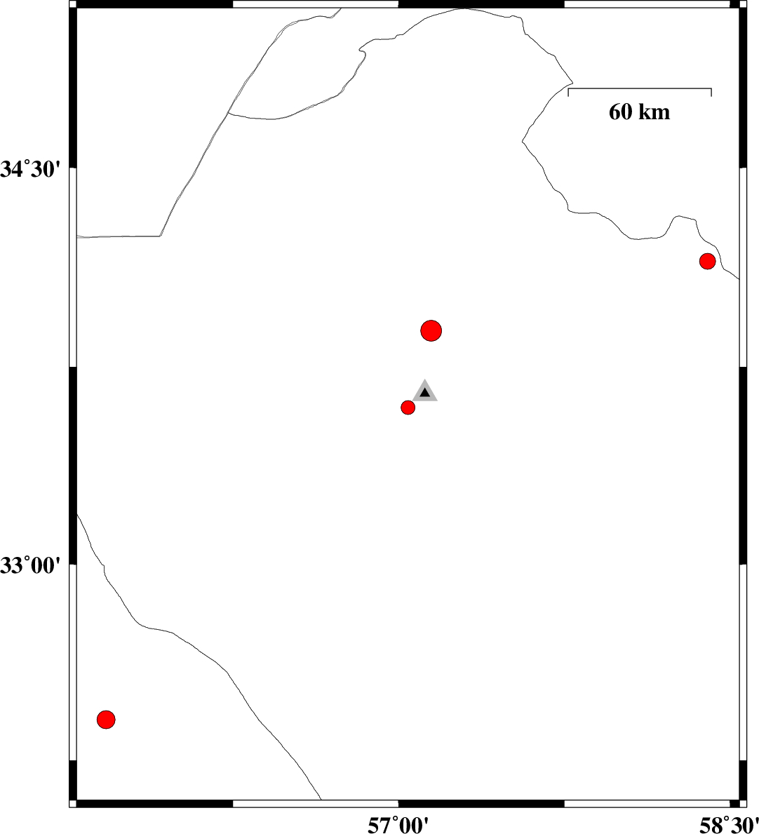 2024/02/28 | 17:49:52.6 | 21:19:52.6 | 33.887 | 57.147 | 12 | ML:4.2 | Khorasan(center) Province, 38 km North-East of Tabas | ||
