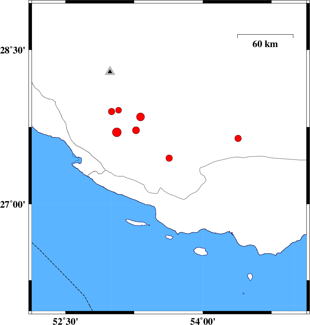 2020/08/25 | 04:41:20.7 | 09:11:20.7 | 27.448 | 53.632 | 12 | ML:3.2 | Fars Province, 48 km North-East of Lamerd | ||
