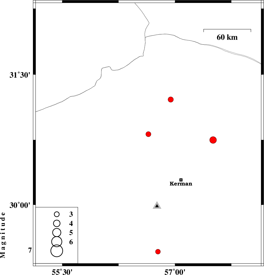 2020/08/05 | 18:55:03.8 | 23:25:03.8 | 30.749 | 57.507 | 12 | ML:4.1 | Kerman Province, 66 km North-East of Kerman |