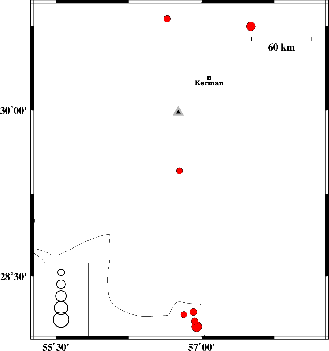 2020/08/05 | 18:55:03.8 | 23:25:03.8 | 30.749 | 57.507 | 12 | ML:4.1 | Kerman Province, 66 km North-East of Kerman |