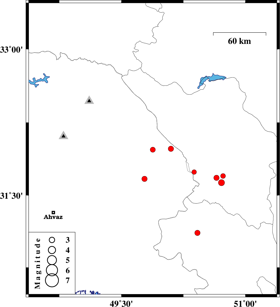 2011/09/07 | 09:34:46.2 | 14:04:46.2 | 31.97 | 49.88 | 32 | ML:2.8 | Khoozestan Province, 15 km North of Izeh | ||