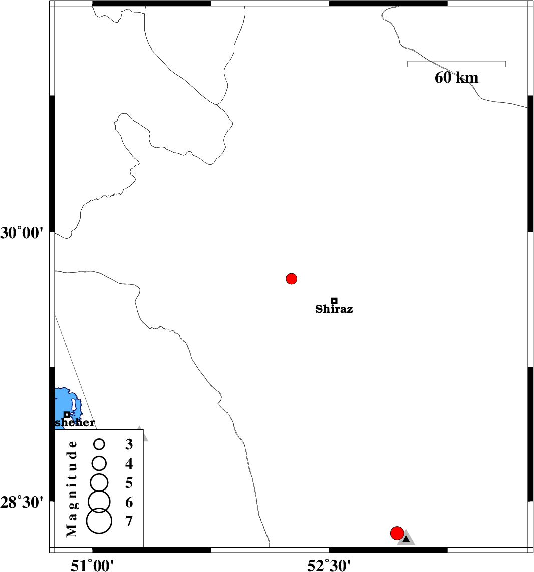 2011/09/17 | 23:37:29.9 | 04:07:29.9 | 28.32 | 52.93 | 6 | ML:3.8 | Fars Province, 19 km South-West of Qir va Karzin |