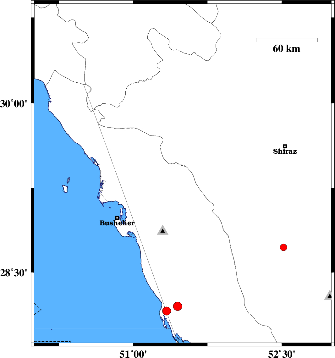 2011/09/26 | 15:51:50.8 | 19:21:50.8 | 29.37 | 51.5 | 14 | ML:3.9 | Bushehr Province, 31 km South-West of Kazerun | ||