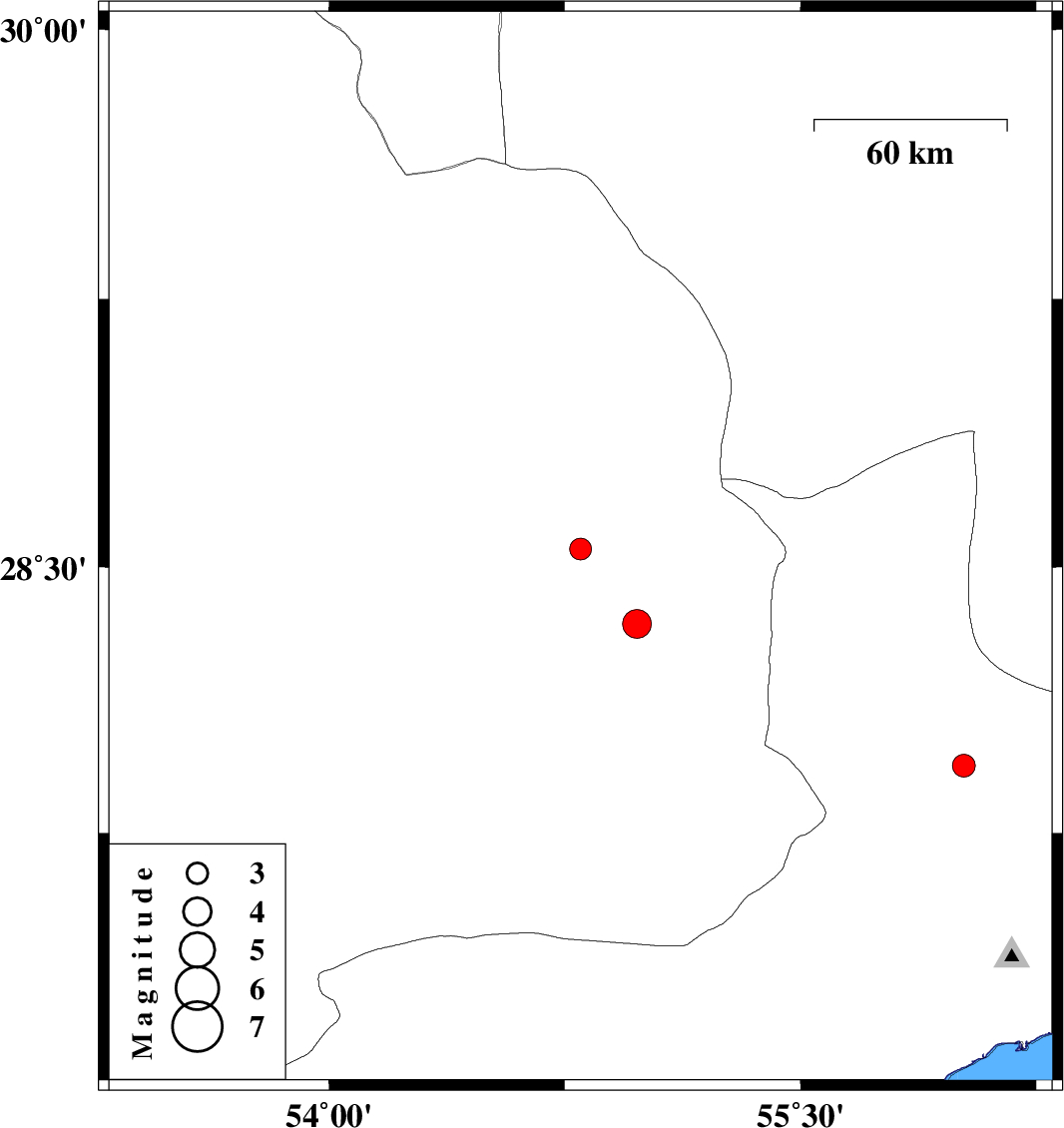 2011/09/16 | 23:07:42.0 | 03:37:42.0 | 28.34 | 54.98 | 41 | ML:4.1 | Fars Province, 63 km South-East of Darab |