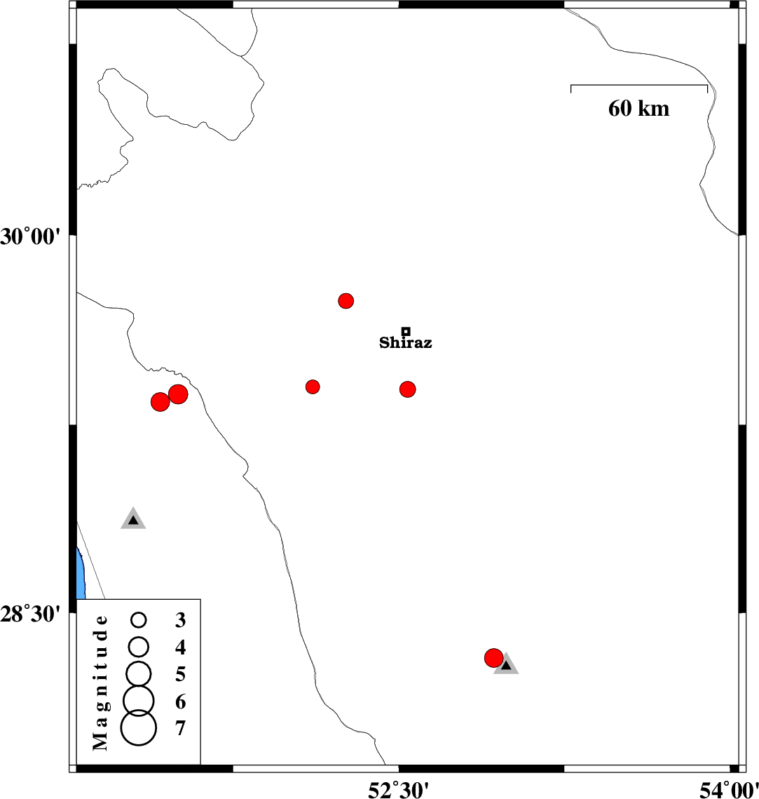 2011/09/26 | 15:51:50.8 | 19:21:50.8 | 29.37 | 51.5 | 14 | ML:3.9 | Bushehr Province, 31 km South-West of Kazerun | ||