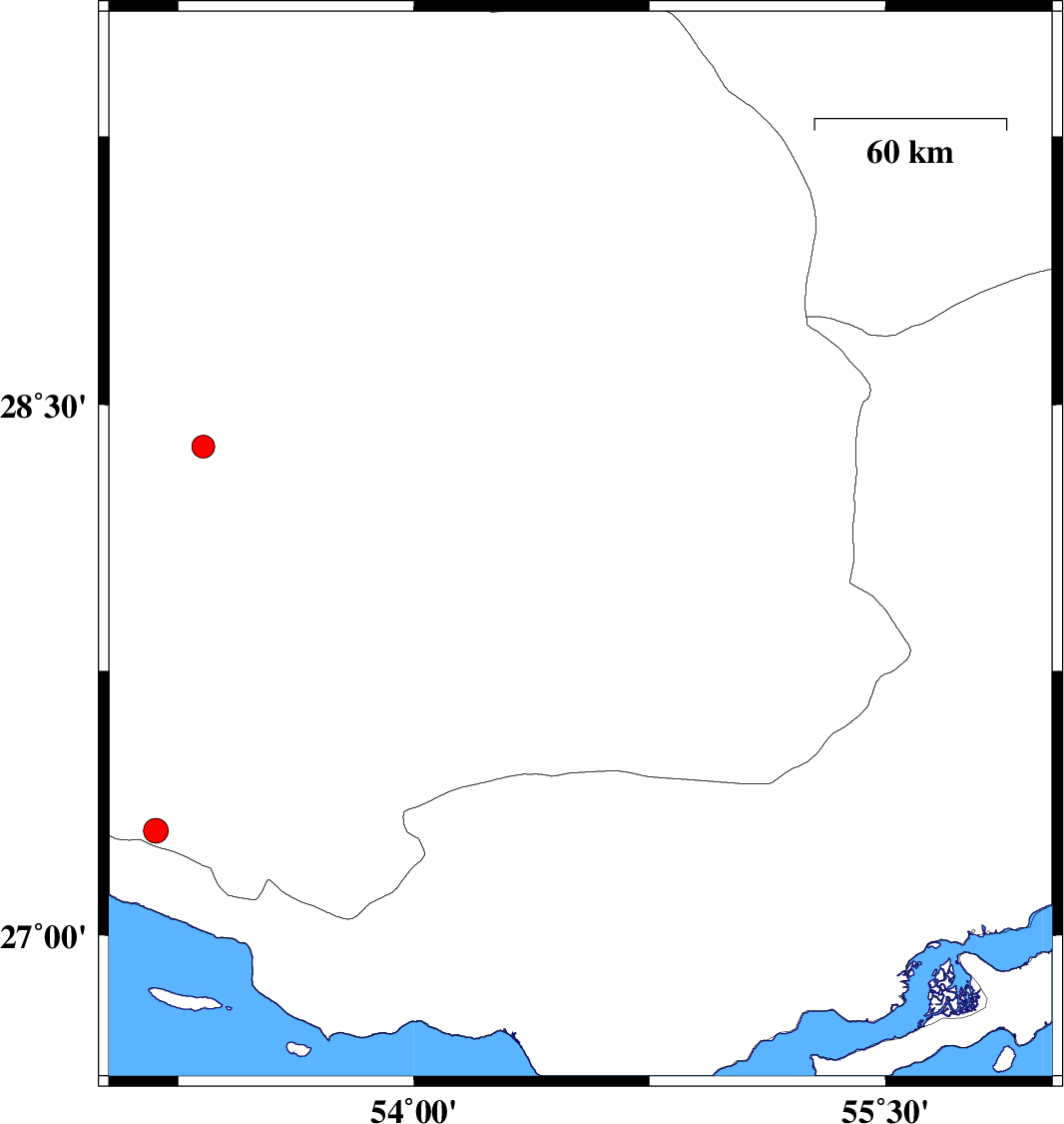 2011/10/19 | 02:52:40.2 | 06:22:40.2 | 28.1 | 54.53 | 18 | ML:5.2 | Fars Province, 50 km North-East of Lar | ||