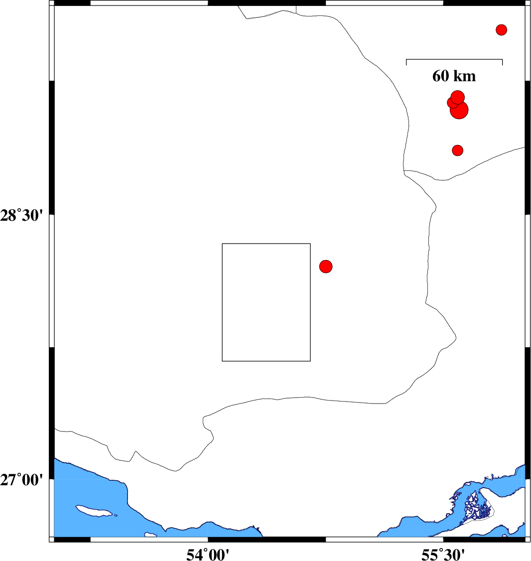 2011/10/19 | 02:52:40.2 | 06:22:40.2 | 28.1 | 54.53 | 18 | ML:5.2 | Fars Province, 50 km North-East of Lar | ||