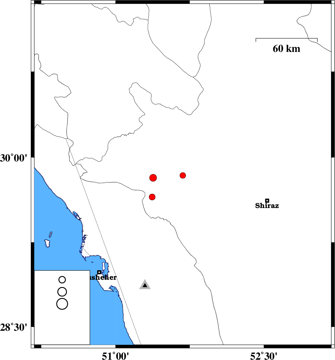 2011/11/17 | 19:40:57.7 | 23:10:57.7 | 29.82 | 51.38 | 41 | ML:3.3 | Fars Province, 36 km South-West of Nurabad | ||