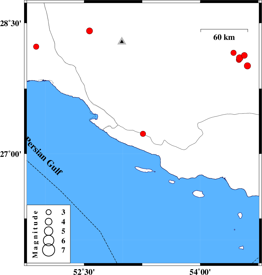 2011/10/20 | 20:26:57.5 | 23:56:57.5 | 28.01 | 54.61 | 14 | ML:3.8 | Fars Province, 45 km North-East of Lar |