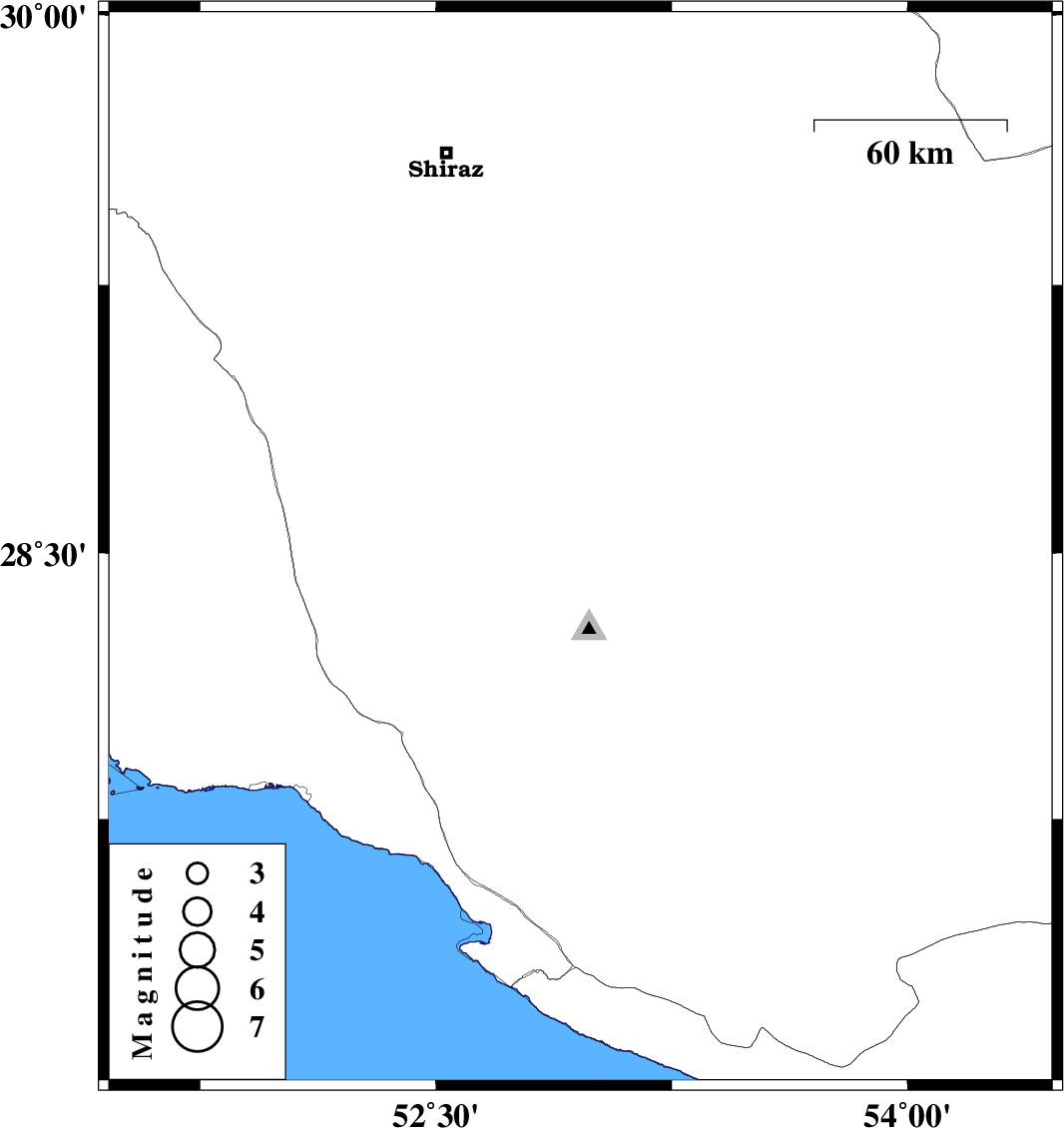 Map Region : lat:27.01-30.01 lon:51.46-54.46 Map's coordinate is invalid North ** West ** East ** South ** Show Cities Province Center None Province And Township Center Show Foreign Cities Yes No Show Fault Mechanism Yes No Show Province Boundaries Yes No Show Stations No Yes With Name Yes Without Name Map Title Invalid Title Get Ascii Data in Format : List Seisan GSE2.0 Prel. Rep.DateTime(UTC)Time(Local)Lat.Lon.DepthMag.RegionWaveform 2011/12/05 09:13:37.9 12:43:37.9 28.5152.9618 ML:2.8 Fars Province, 9 km Qir va Karzin