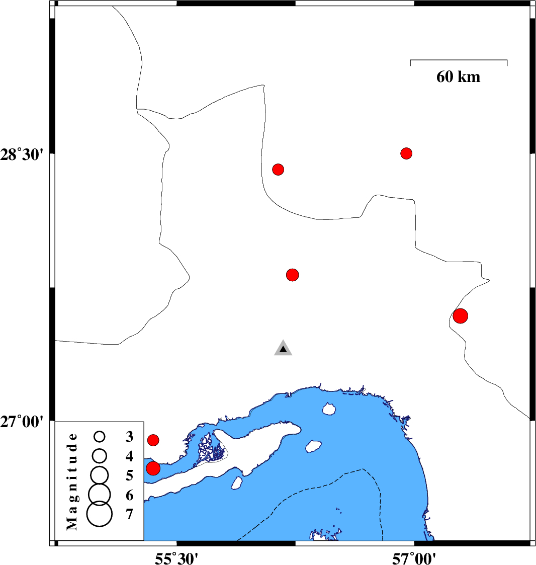 2011/11/20 | 07:20:16.6 | 10:50:16.6 | 26.73 | 55.35 | 39 | ML:4 | Persian Gulf, 55 km North-East of Bandar-e lengeh | ||