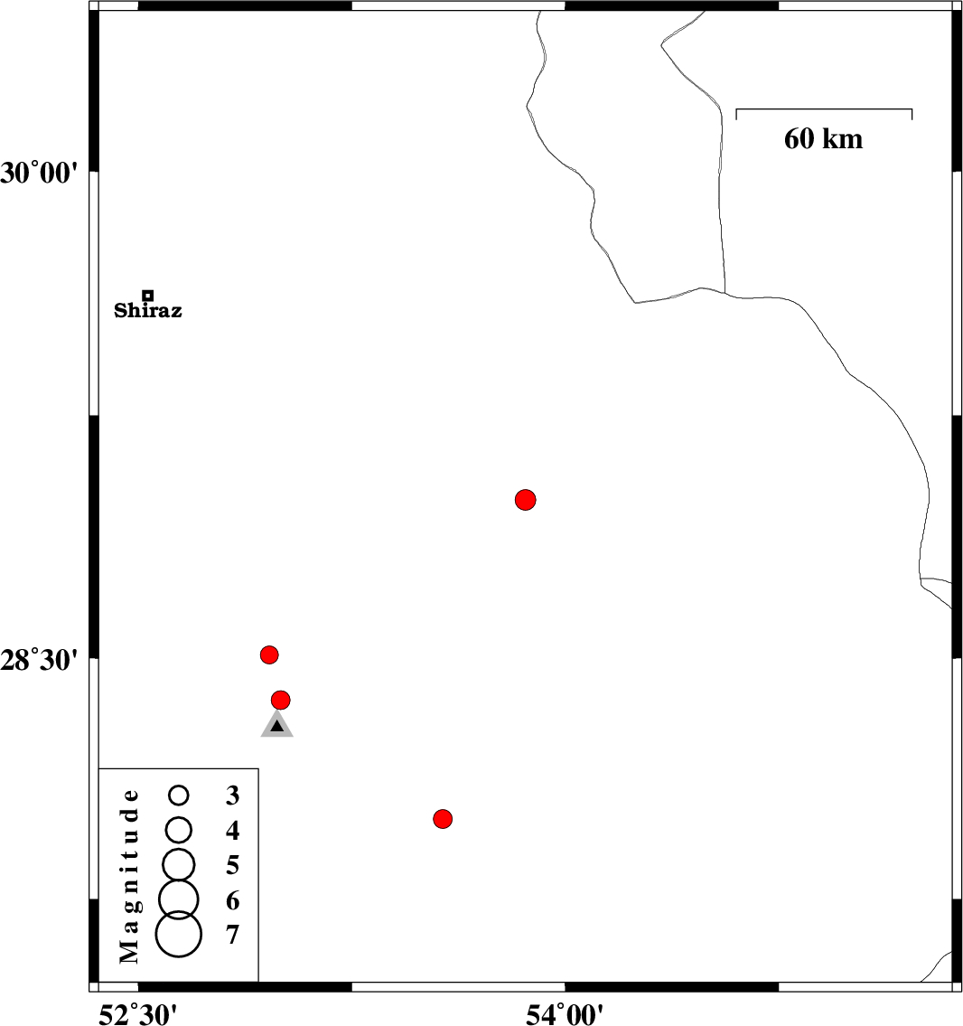 2011/12/11 | 21:50:54.6 | 01:20:54.6 | 28 | 53.57 | 18 | ML:2.9 | Fars Province, 55 km South of Jahrom | ||