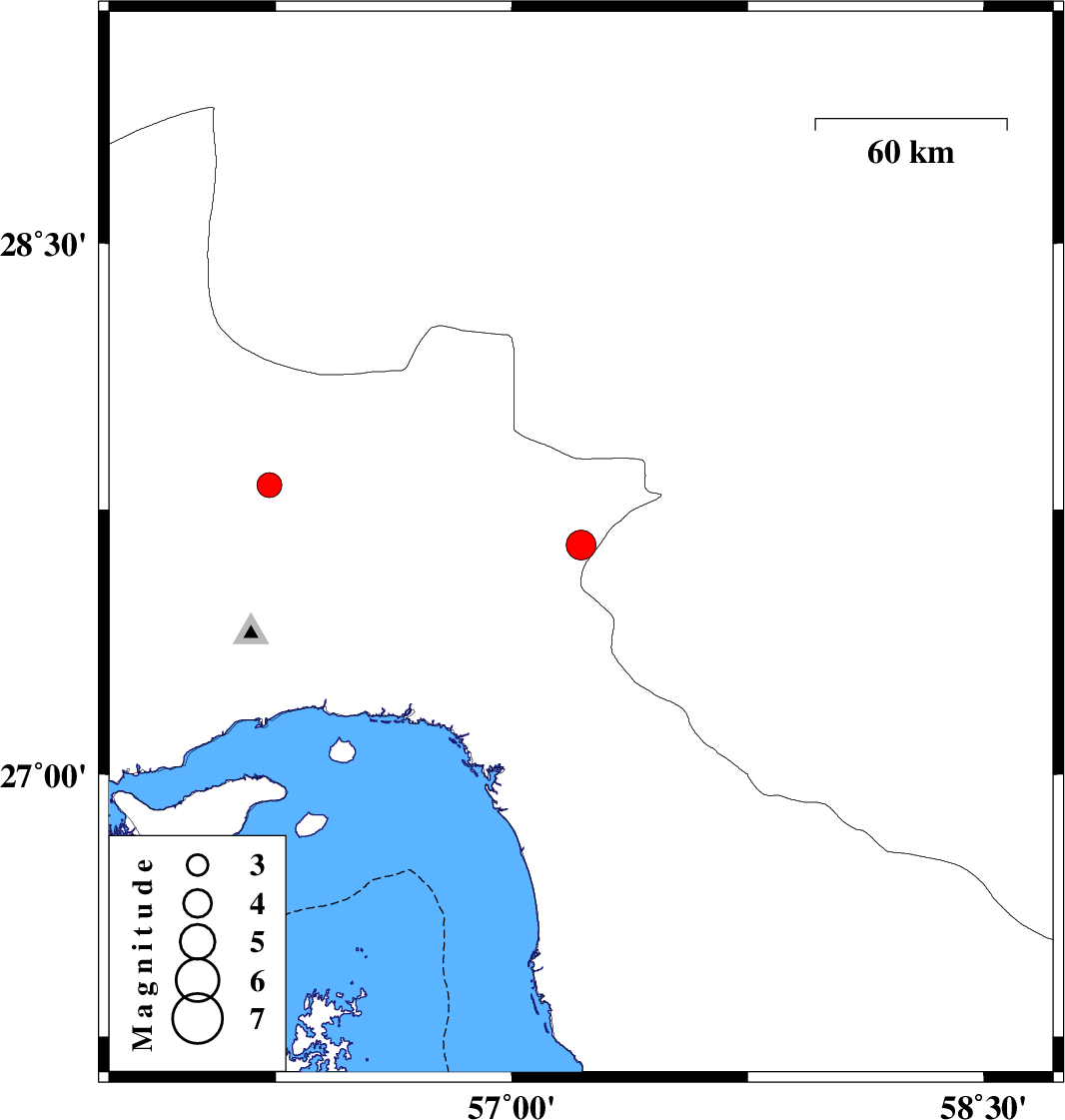 2011/12/14 | 15:56:46.7 | 19:26:46.7 | 27.82 | 56.23 | 14 | ML:3.5 | Hormozgan Province, 71 km North of Bandar-e abbas |