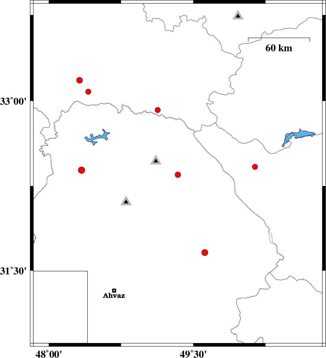 2011/11/29 | 06:53:05.5 | 10:23:05.5 | 32.92 | 49.13 | 15 | ML:2.6 | Lorestan Province, 59 km North of Lali |