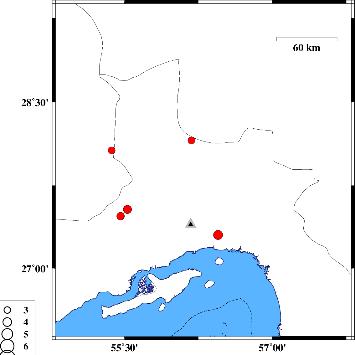 2011/12/28 | 10:23:48.8 | 13:53:48.8 | 27.88 | 56.3 | 14 | ML:3.8 | Hormozgan Province, 77 km North of Bandar-e abbas | ||