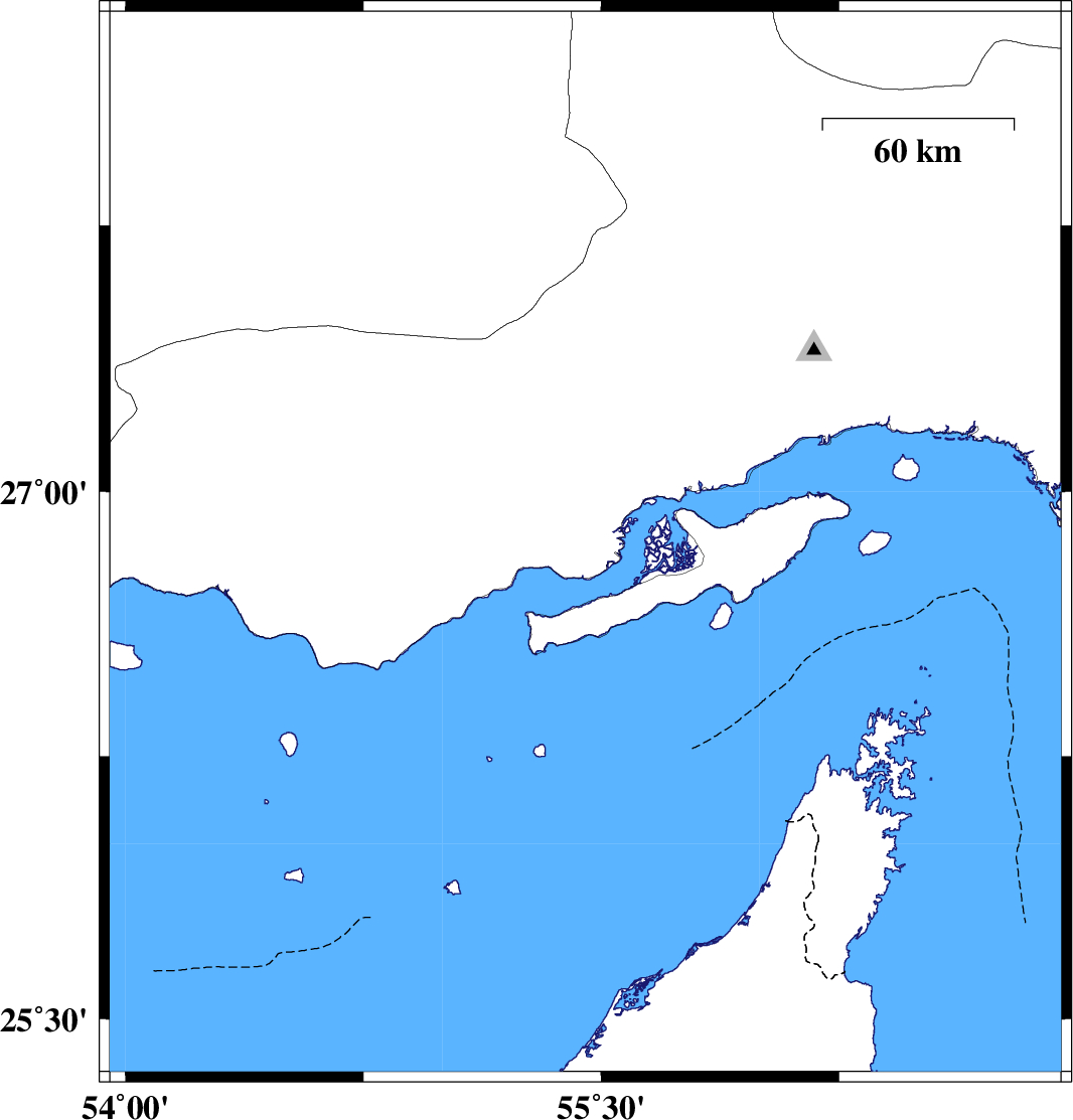 2011/12/28 | 19:15:27.0 | 22:45:27.0 | 26.85 | 55.45 | 17 | ML:3 | Hormozgan Province, 81 km South-West of Qeshm | ||