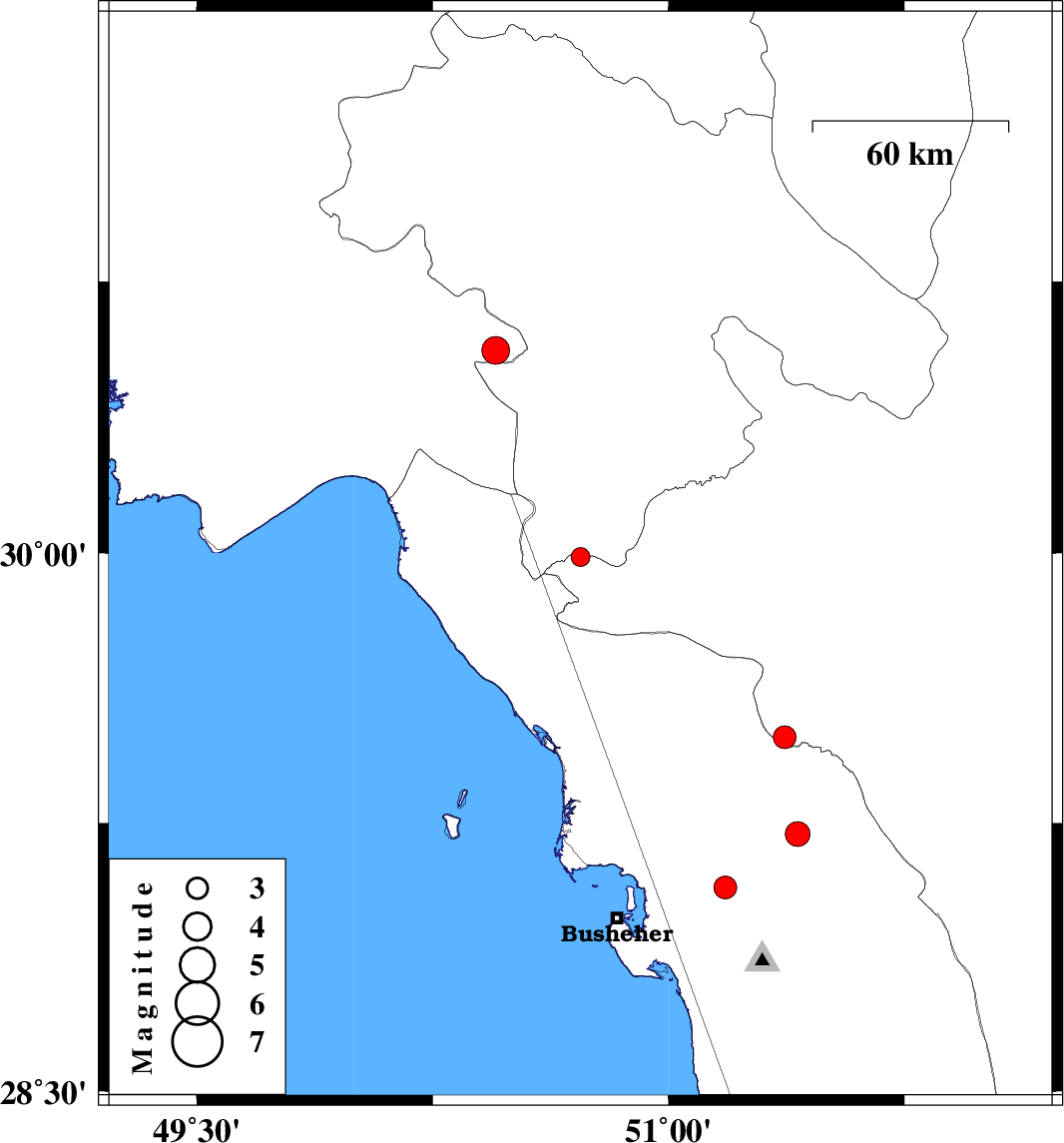 2011/12/05 | 06:12:45.0 | 09:42:45.0 | 29.22 | 51.41 | 3 | ML:3.5 | Bushehr Province, 20 km East of Borazjan |