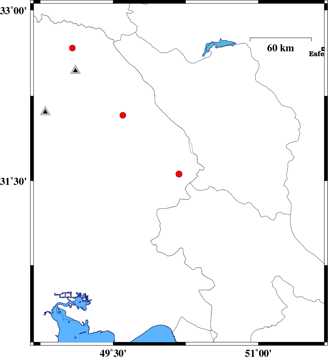 2012/01/04 | 03:09:11.3 | 06:39:11.3 | 31.56 | 50.18 | 15 | ML:3 | Khoozestan Province, 27 km East of Bagh Malek | ||