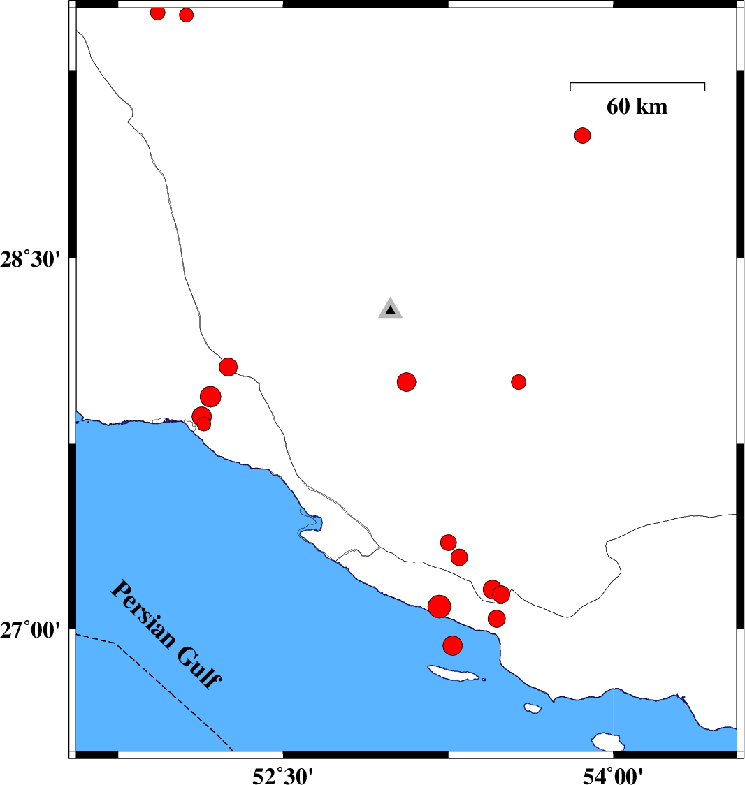 Bushehr Province, 17 km North-East of Bandar-e kangan | |