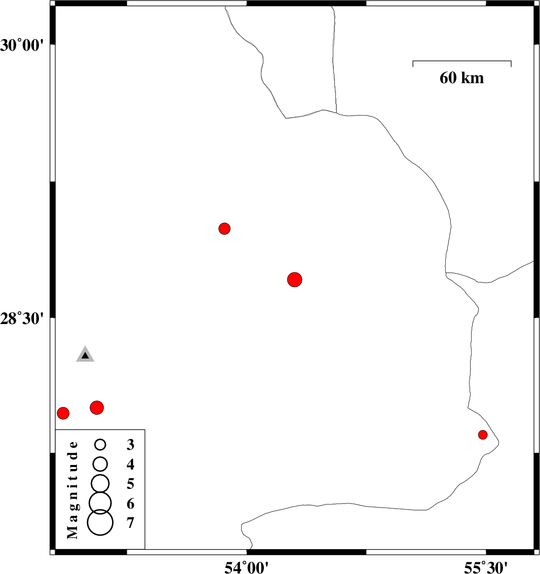 2011/12/17 | 08:10:11.7 | 11:40:11.7 | 28.99 | 53.86 | 6 | ML:3.2 | Fars Province, 21 km East of Fasa |