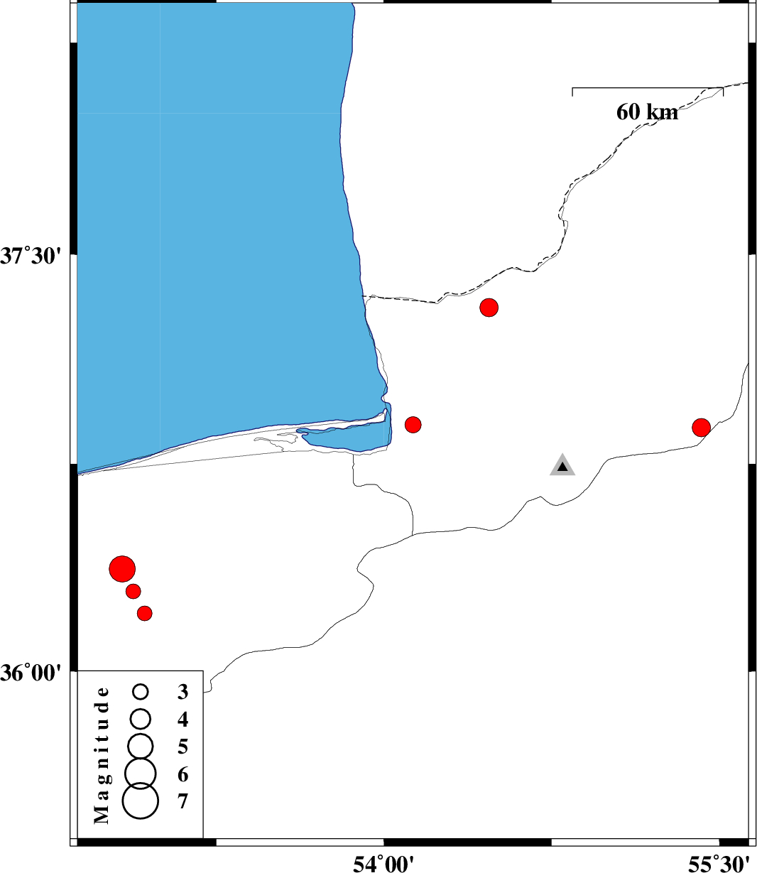 2012/01/07 | 15:12:23.2 | 18:42:23.2 | 36.88 | 55.42 | 14 | ML:3.6 | Golestan Province, 39 km South of Minodasht |