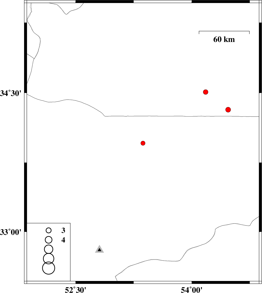 2012/01/09 | 08:18:45.6 | 11:48:45.6 | 34.51 | 54.18 | 14 | ML:2.8 | Semnan Province, 184 km South-West of Damghan |