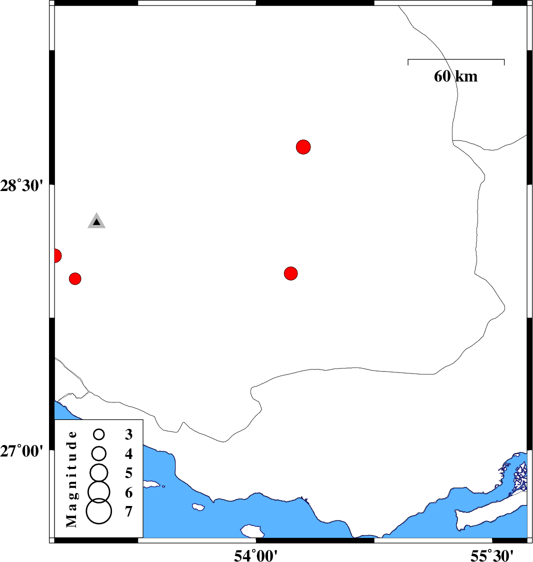 2012/01/07 | 23:25:33.8 | 02:55:33.8 | 28.1 | 52.72 | 14 | ML:4 | Fars Province, 50 km North-East of Jam |