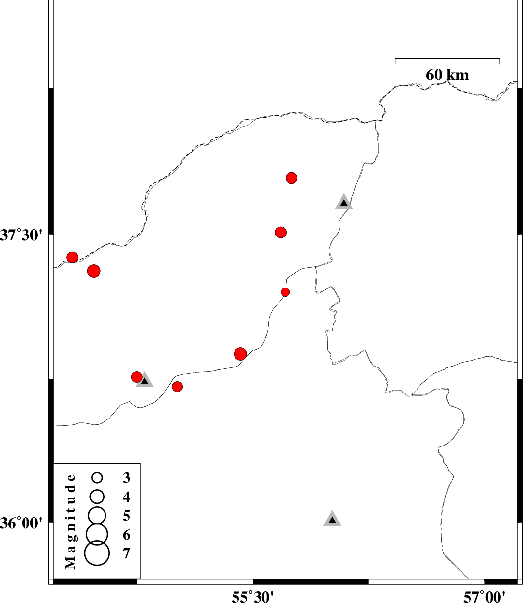 2012/01/03 | 16:47:33.3 | 20:17:33.3 | 37.51 | 55.68 | 15 | ML:3.3 | Golestan Province, 22 km North-East of Kalaleh | ||