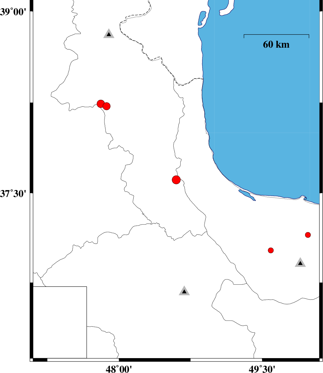 2012/01/03 | 00:56:30.8 | 04:26:30.8 | 38.24 | 47.81 | 14 | ML:3.6 | Ardebil Province, 22 km South-East of Meshgin Shahr | ||
