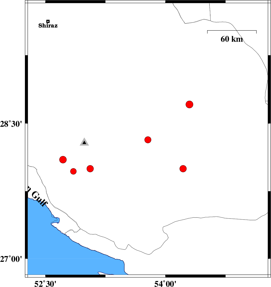 2012/01/07 | 23:25:33.8 | 02:55:33.8 | 28.1 | 52.72 | 14 | ML:4 | Fars Province, 50 km North-East of Jam | ||