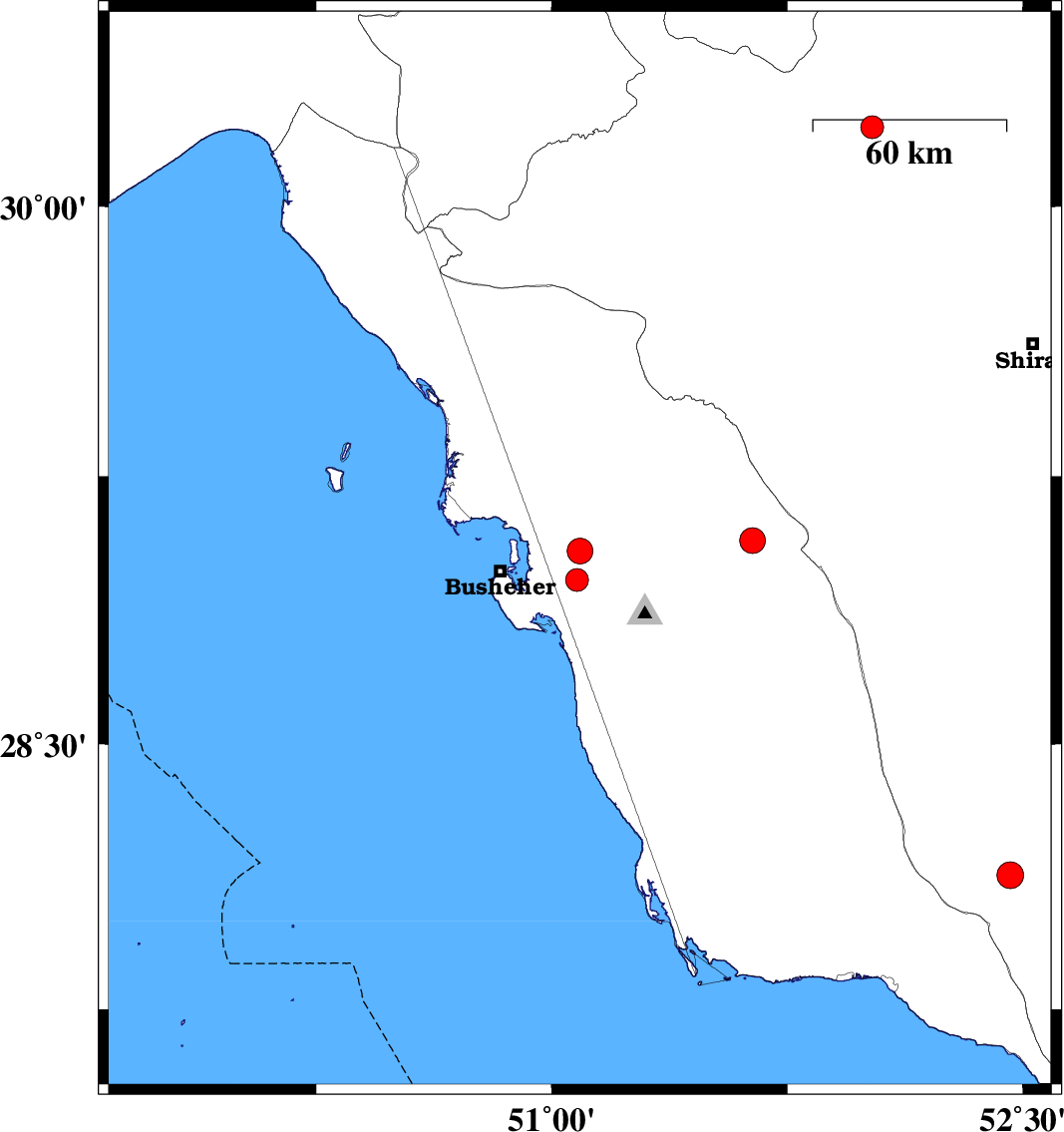 2012/01/25 | 16:18:25.8 | 19:48:25.8 | 29.04 | 51.09 | 12 | ML:3.7 | Bushehr Province, 26 km East of Busheher | ||