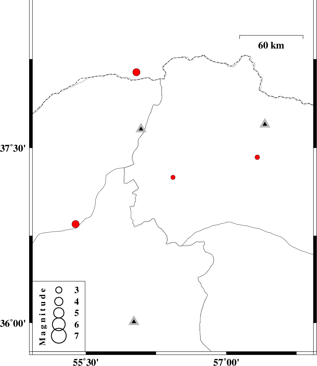 2012/02/20 | 13:52:42.5 | 17:22:42.5 | 37.25 | 56.43 | 46 | ML:2.1 | Khorasan(north) Province, 33 km North of Jajarm | ||