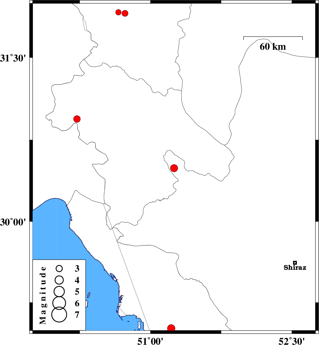 2012/02/25 | 22:09:29.7 | 01:39:29.7 | 30.49 | 51.25 | 38 | ML:3.5 | Fars Province, 37 km South-West of Yasuj | ||