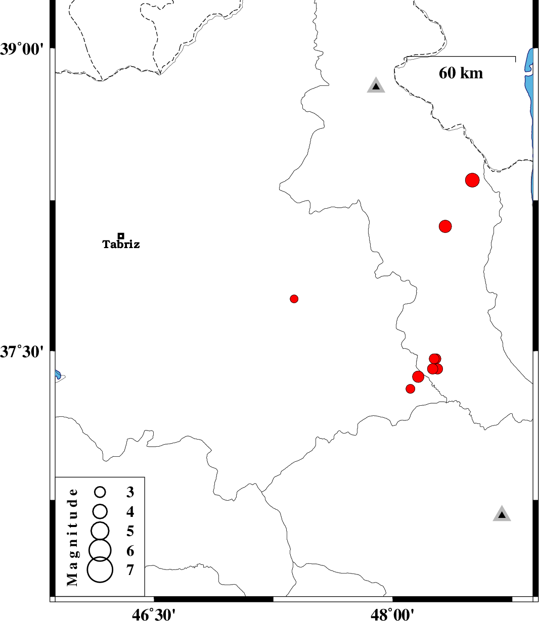 2012/03/03 | 15:00:42.5 | 18:30:42.5 | 37.76 | 47.38 | 59 | ML:2.3 | Azarbaijan Sharghi Province, 24 km South-West of Sarab | ||