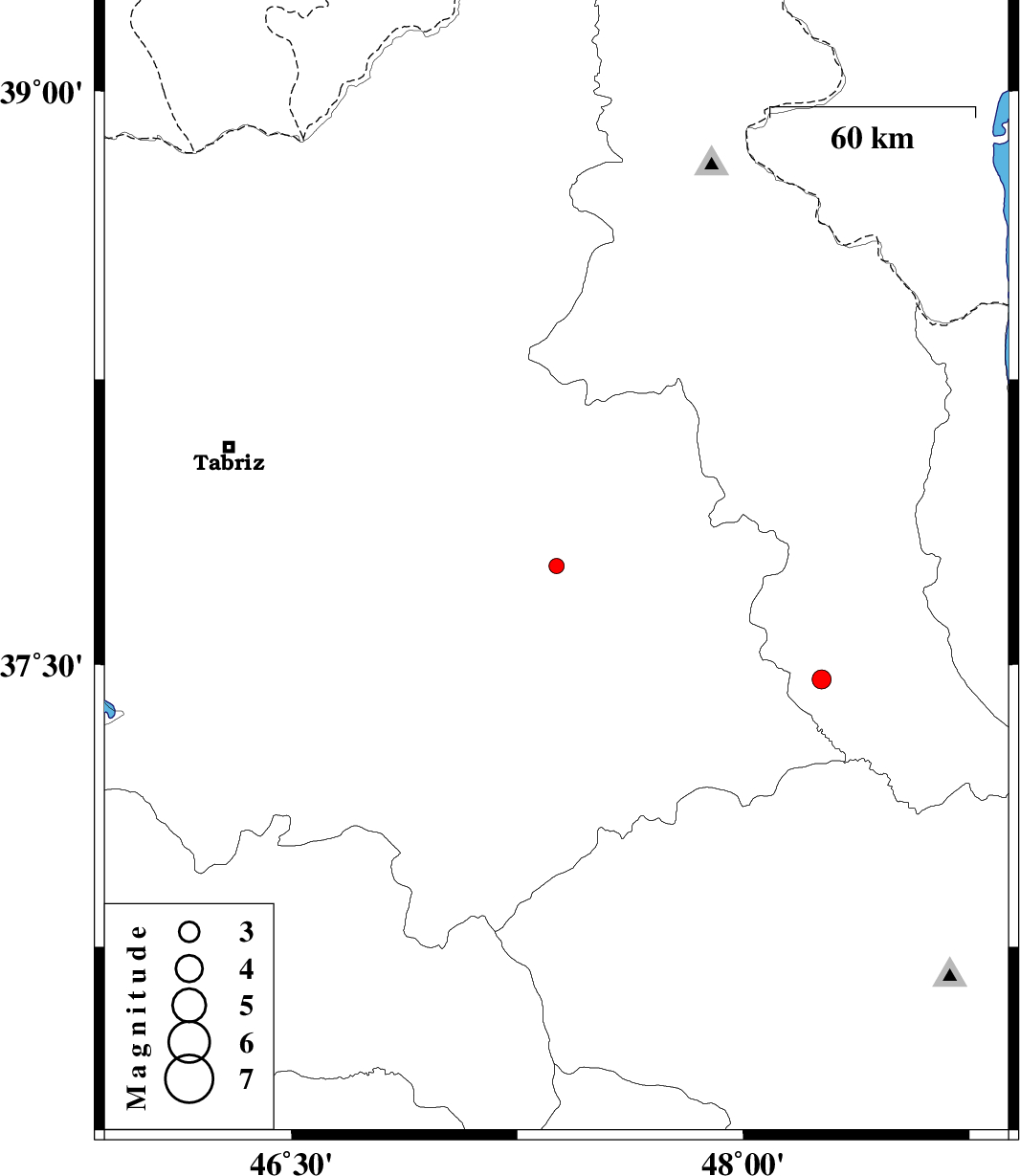 2012/03/03 | 15:00:42.5 | 18:30:42.5 | 37.76 | 47.38 | 59 | ML:2.3 | Azarbaijan Sharghi Province, 24 km South-West of Sarab | ||