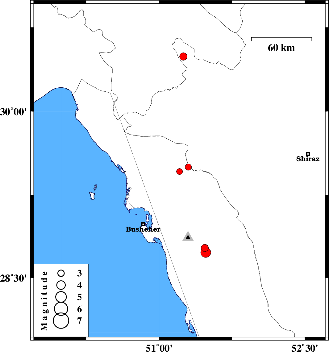2012/03/06 | 17:59:08.8 | 21:29:08.8 | 29.5 | 51.3 | 31 | ML:2.9 | Bushehr Province, 28 km North of Borazjan | ||