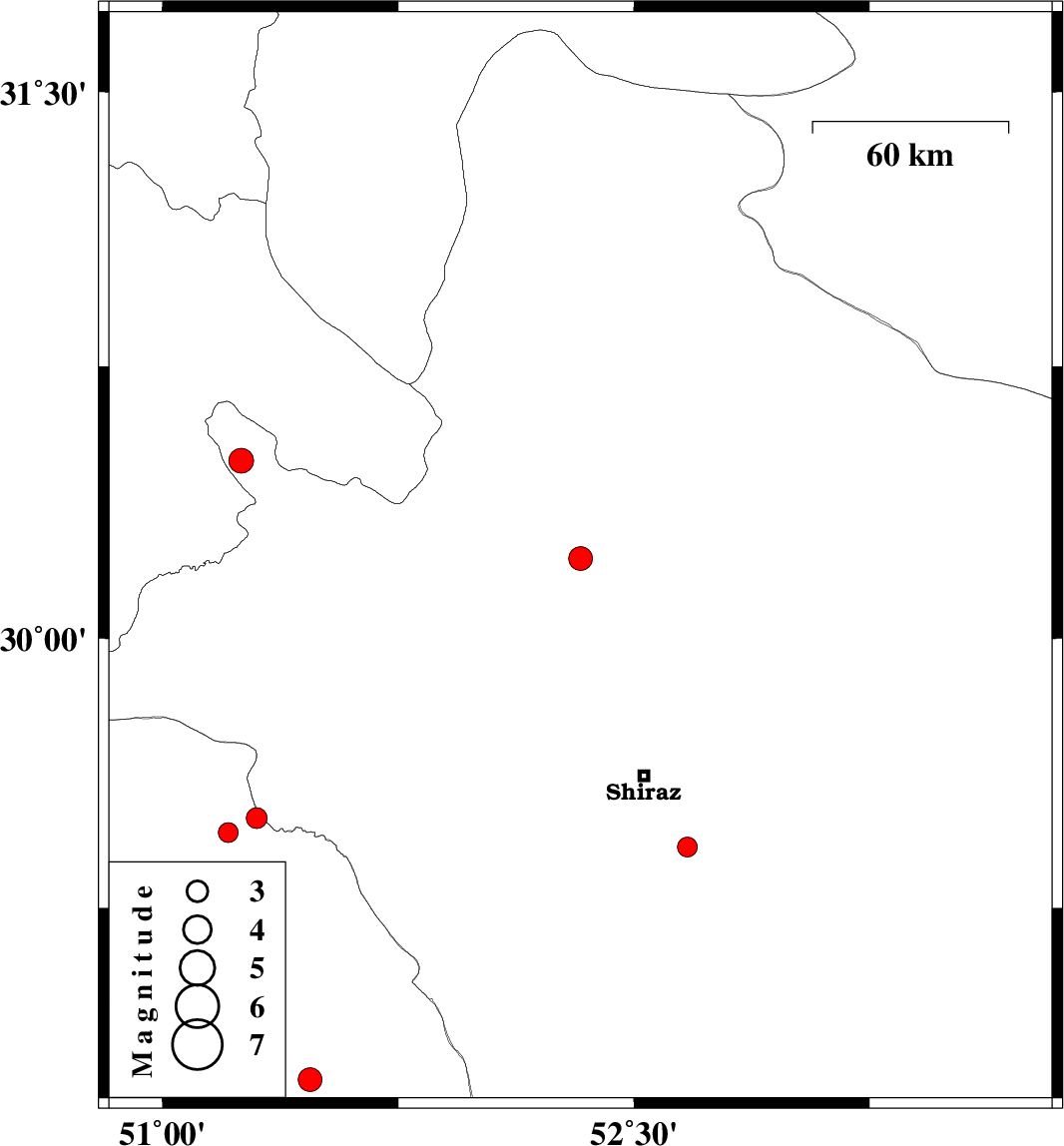 2012/03/07 | 21:20:46.1 | 00:50:46.1 | 29.42 | 52.67 | 14 | ML:2.8 | Fars Province, 26 km South-East of Shiraz | ||