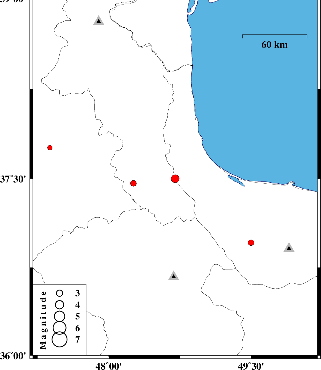 2012/03/11 | 03:28:51.3 | 06:58:51.3 | 37.5 | 48.7 | 14 | ML:3.8 | Gilan Province, 20 km South-East of Khalkhal | ||