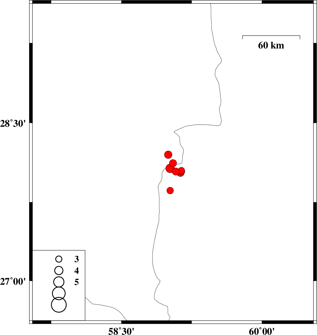 2012/03/11 06:03:17.5 09:33:17.5 27.8659.0215 ML:3.2 Sistan va Baloochestan Province, 131 km East of Kahnuj